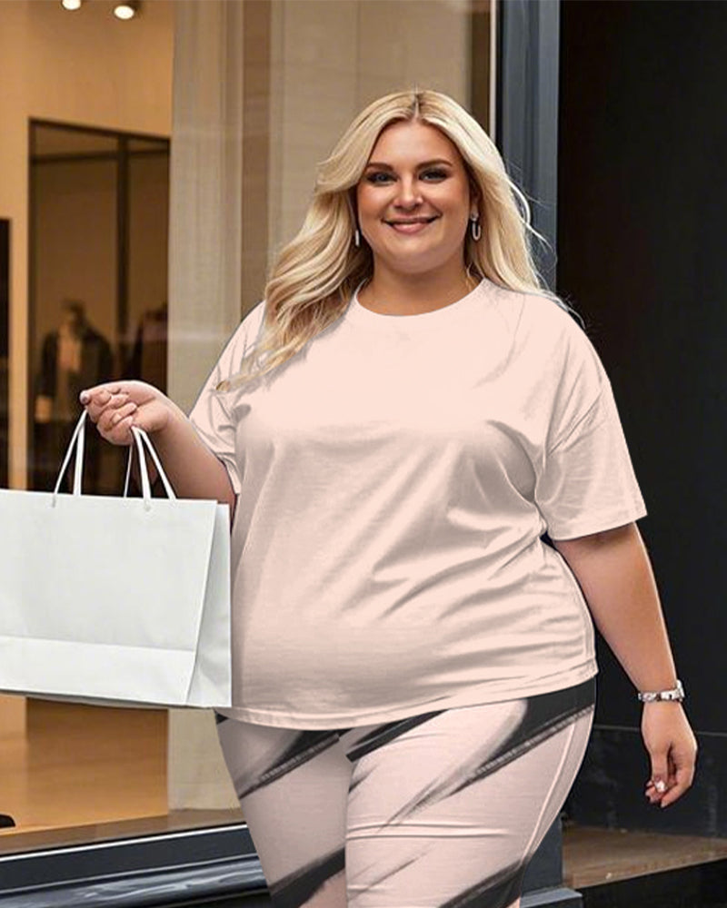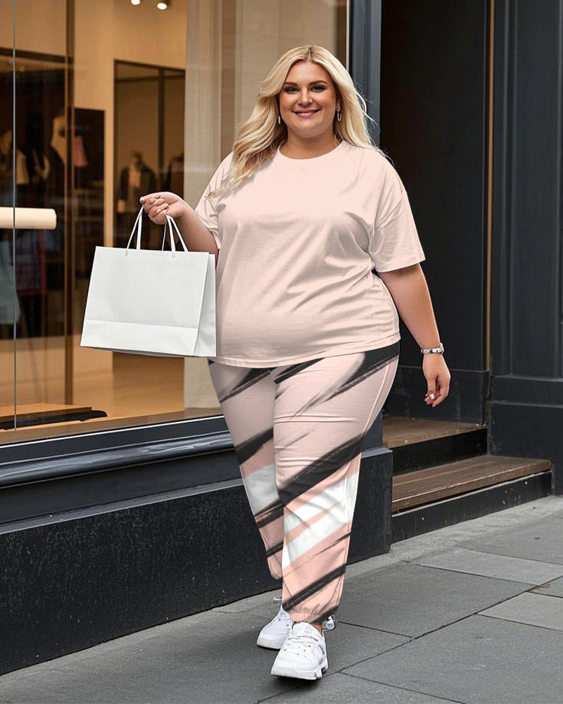 Women's Plus Size Solid Color T-Shirt and Printing Stripes Trousers Suit