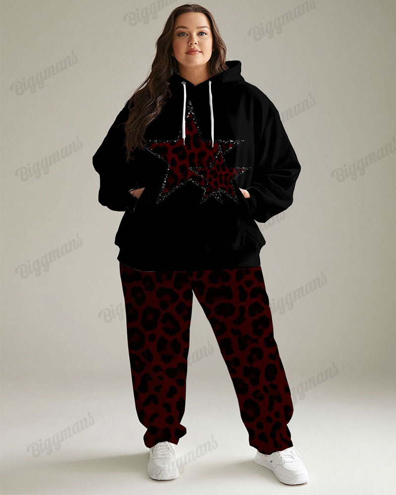 Women's Street Fashion Vintage Leopard Star Print Plus Size Hoodie Suit