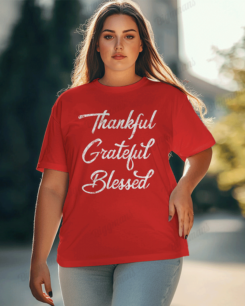 Radiate positive energy in this vibrant red short-sleeve featuring uplifting "Thankful Grateful Blessed" typography. The premium poly-blend fabric offers cloud-like softness, while the feminine, tailored cut flatters your silhouette for confident everyday wear. Share your grateful spirit wherever you go.